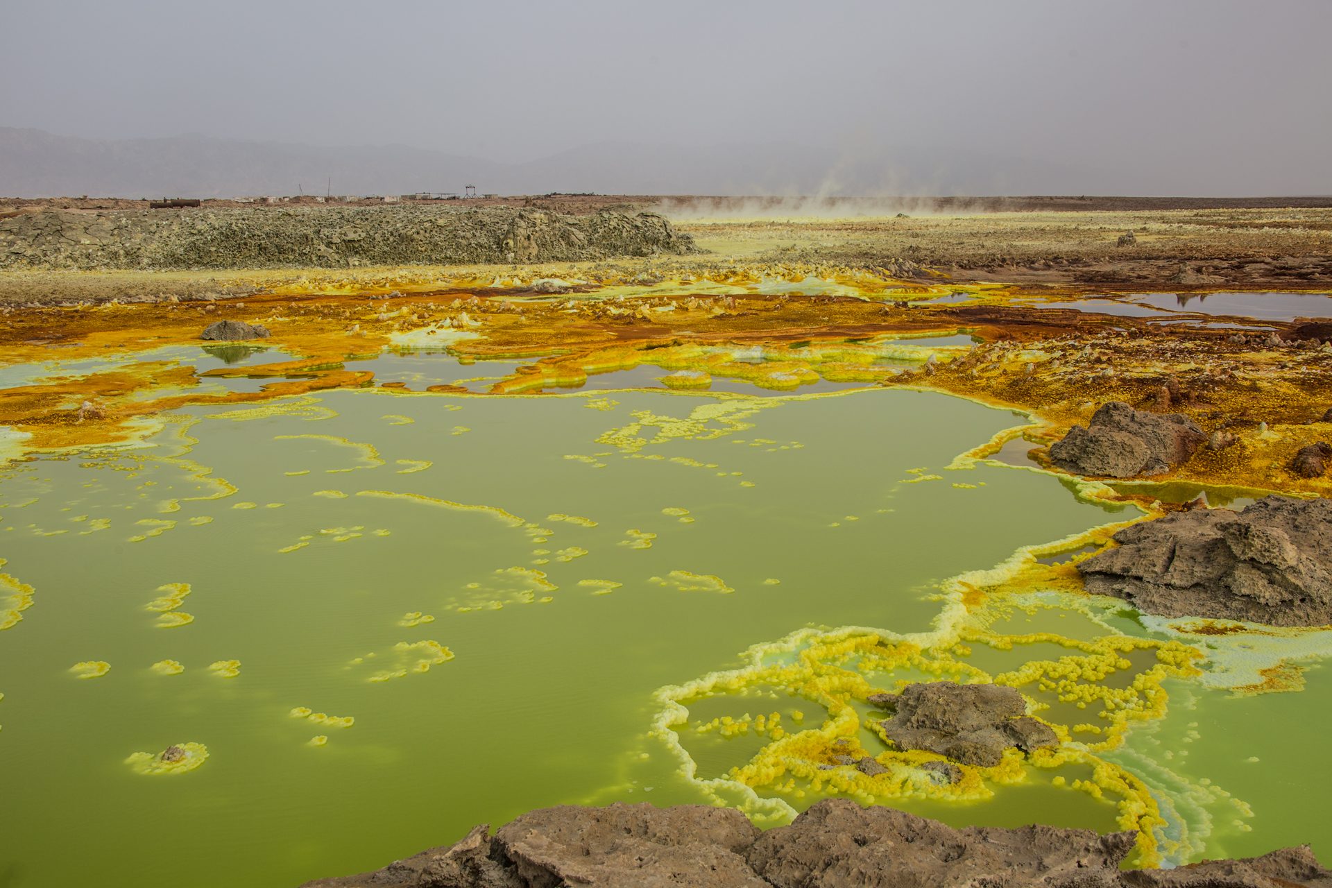 La región del Danakil es única en el planeta, a nivel geológico, natural y cultural. Se trata del punto más caluroso del globo, superando en determinadas épocas del año los 60 grados. Allí, existe la posibilidad de recorrer el enigmático e infinito lago de sal, recorrer terrenos donde el azufre tiñe de amarillos y verdes paisajes que parecen de otro planeta y encumbrar volcanes activos. No es de extrañar que sea el único lugar del mundo donde no existe ningún tipo de vida microscópica.