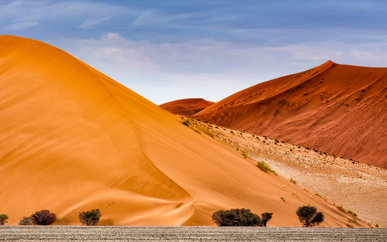El desierto que da nombre al país es conocido por sus increíbles dunas de color rojo. Pero también por ser el más antiguo del mundo: se calcula que ya existía hace 65 millones de años. La zona más visitada del Namib es el parque nacional Namib-Naukluft, donde están las famosas dunas 45 y Big Daddy, de unos 300 metros de altitud.