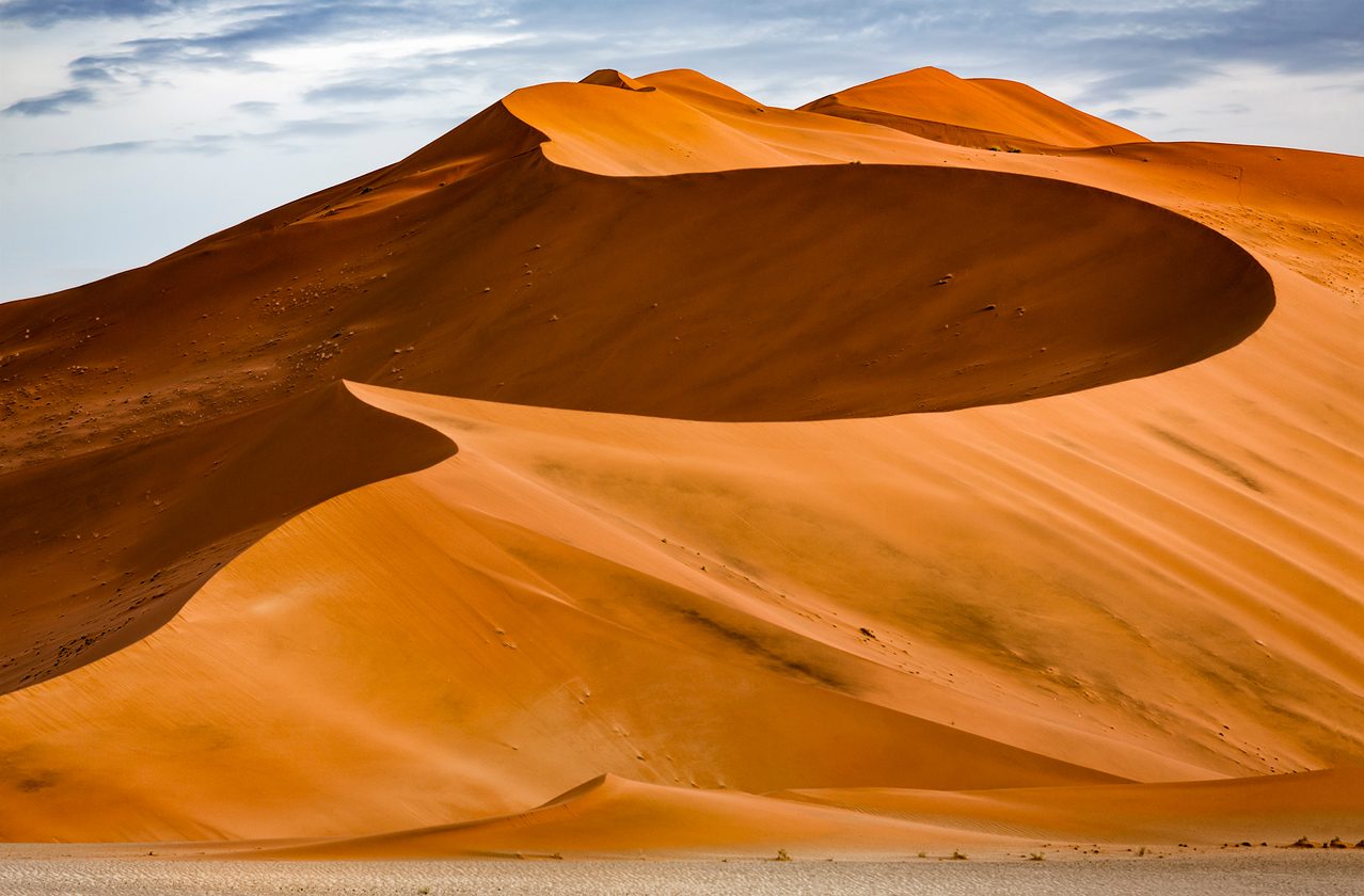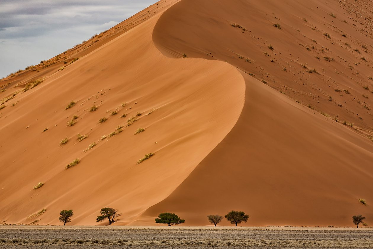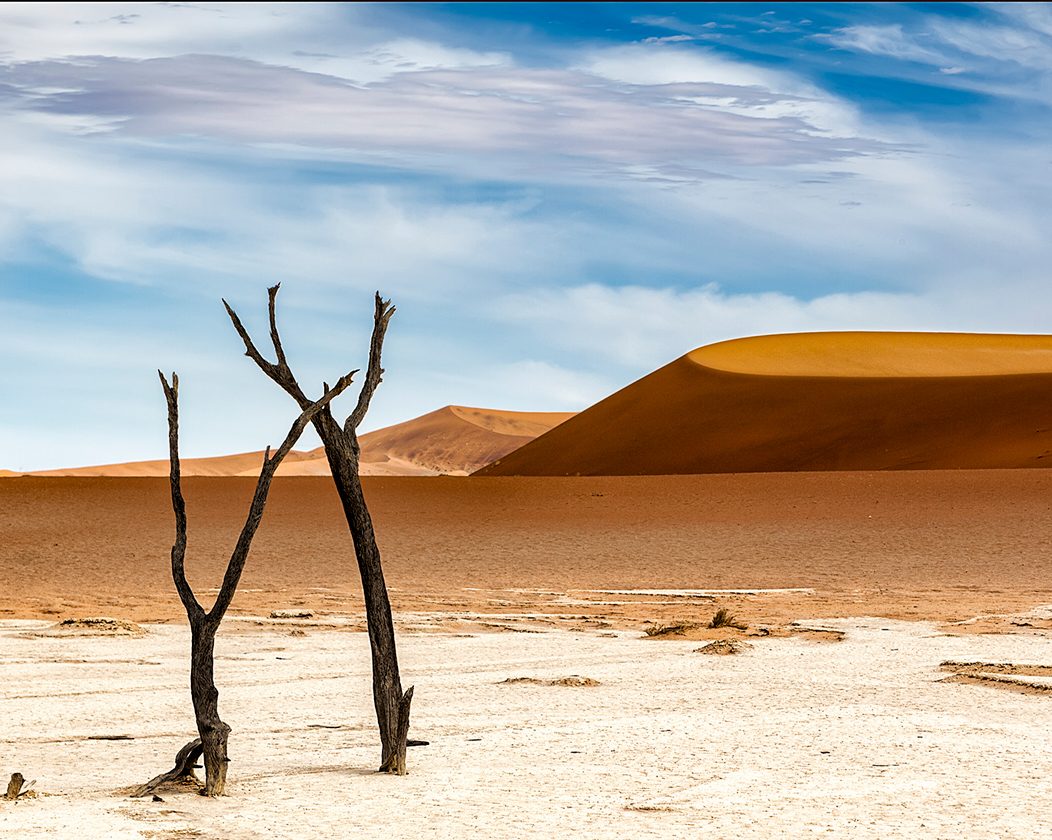 Una de las zonas más fotogénicas del parque Namib-Naukluft son estas antiguas lagunas desecadas con una capa de arcilla blanca en el fondo -originada por la fuerte evaporación- y rodeadas por dunas rojizas. Sobre ellas crecen espectrales los fantasmas de árboles que parecen petrificado, pero que en realidad están “momificados” por la intensa deshidratación. Algunos tiene unos 900 años de antigüedad.