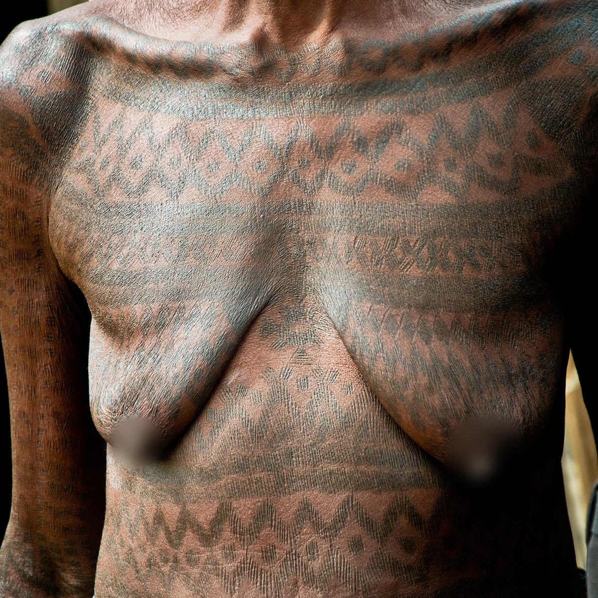 Me parecían preciosos los pueblos de Ohori, construidos en bambú (algo raro en África) y la generación nacida hasta 1965 tenía tatuajes y escarificaciones espectaculares. Las mujeres de aquellas generaciones posteriores a 1965 lucían dibujos tatuados en sus senos, abdomen, cuello, brazos y piernas. Verdaderas obras de arte. Solo he visto diseños de esta calidad en los Kuba y Yombe del Congo, así como entre tribus asiáticas como los Naga. En el caso de los Ohori se aplican técnicas de escarificación y tatuado, es decir, corte y pigmentación. El resultado es fabuloso. Después de entrevistar a más de veinte mujeres, comprendí que a partir de 1965 los misioneros protestantes de la vecina Nigeria forzaron el abandono de la práctica del tatuaje. La escarificación facial ha sobrevivido hasta nuestros días, pero también tiende a desaparecer. El proyecto Last Places no solo facilita las visitas a estas últimas sociedades tradicionales de Benín, sino que también recopila información sobre estos pueblos y busca formas de colaborar y ayudar a preservar estas culturas únicas.