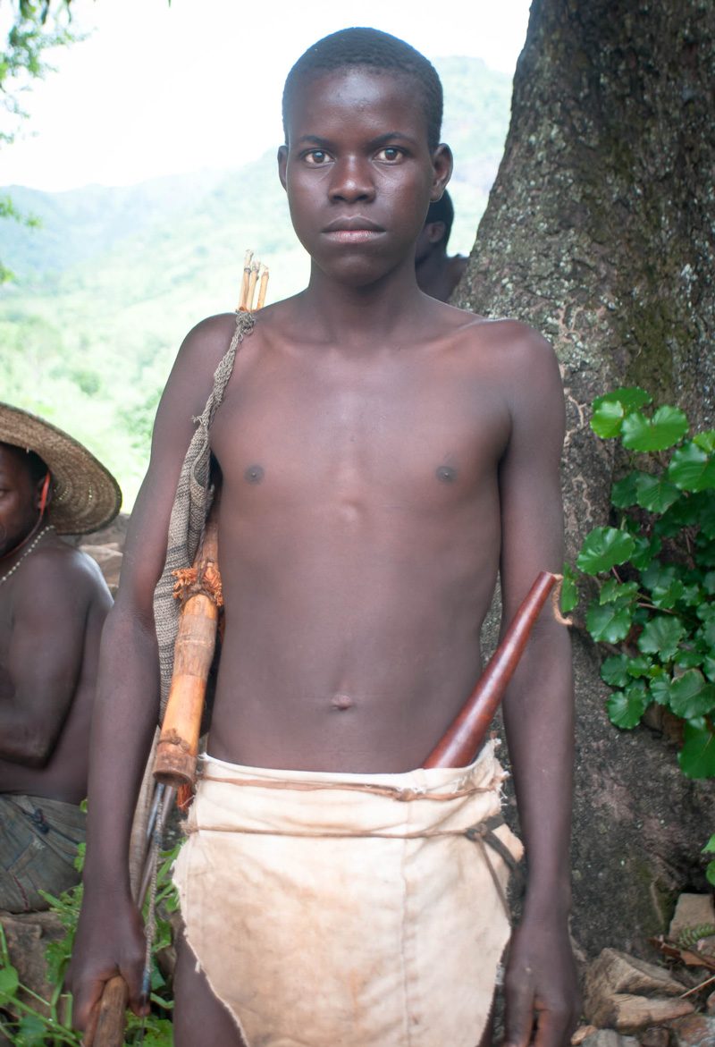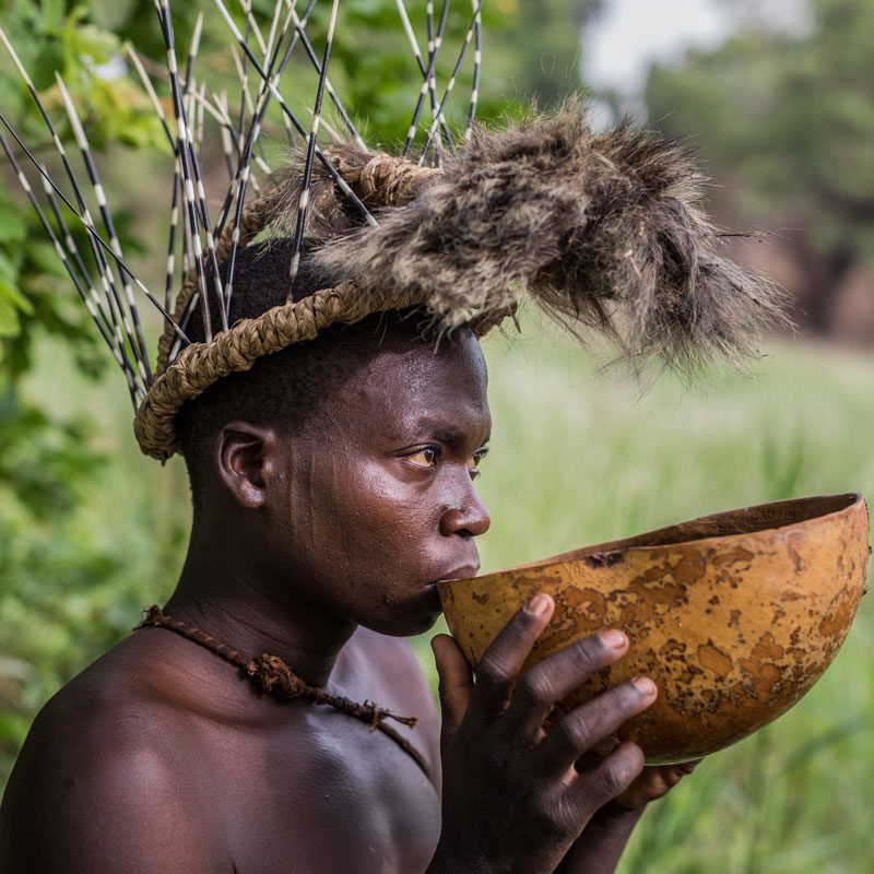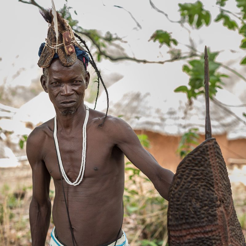 Joven dupá con sombrero tradicional hecho con espinas y pelaje de puerco espín