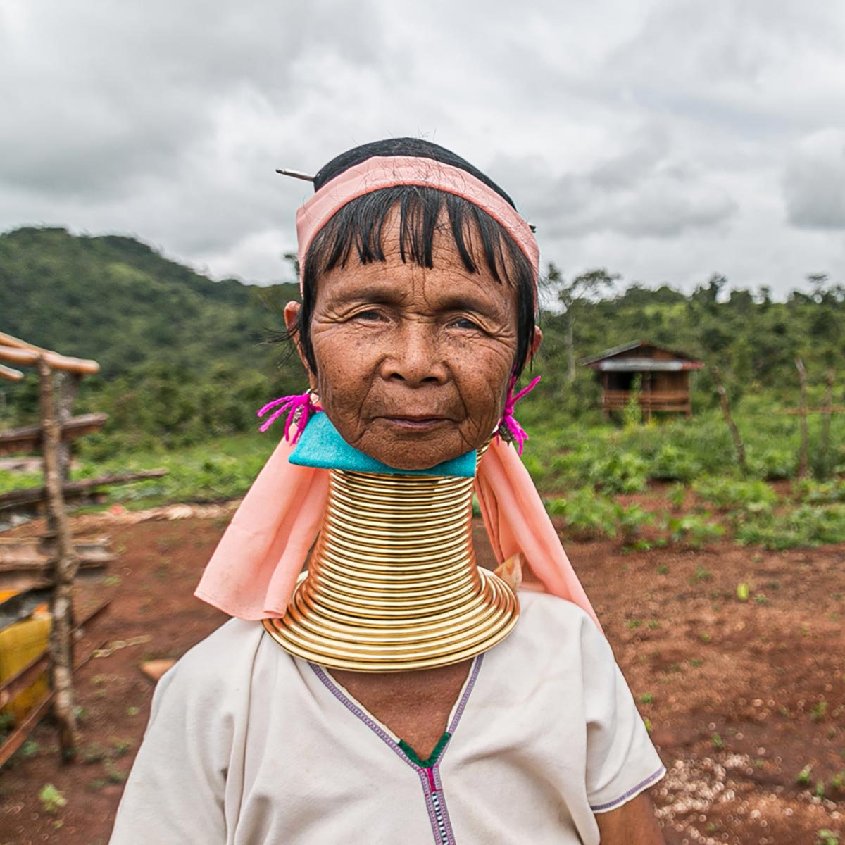Una de estas minorías son las mujeres Padaung que habitan el estado Shan. Desde la edad de cinco años portan un pesado y largo collar metálico, que va presionando poco a poco la clavícula hacia abajo mediante la adición de anillos, haciendo que parezca que tienen el cuello más largo. Cuello largo, signo de belleza o riqueza y símbolo identitario.
