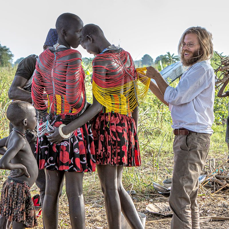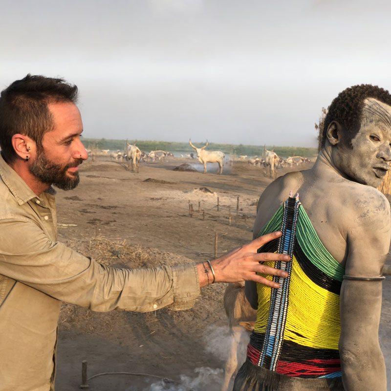 Aníbal Bueno ayudando a un hombre mundari a colocarse su corsé