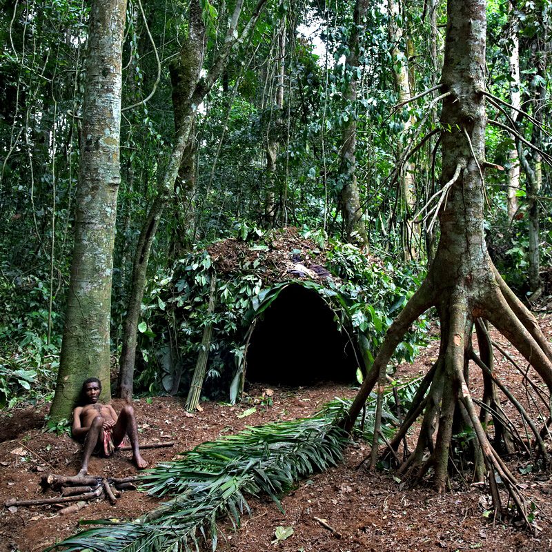 Los grupos establecen campamentos temporales formados por cabañas construidas con ramas arqueadas, cubiertas de hojas grandes (aunque hoy en día se construyen cada vez más casas siguiendo métodos bantúes).