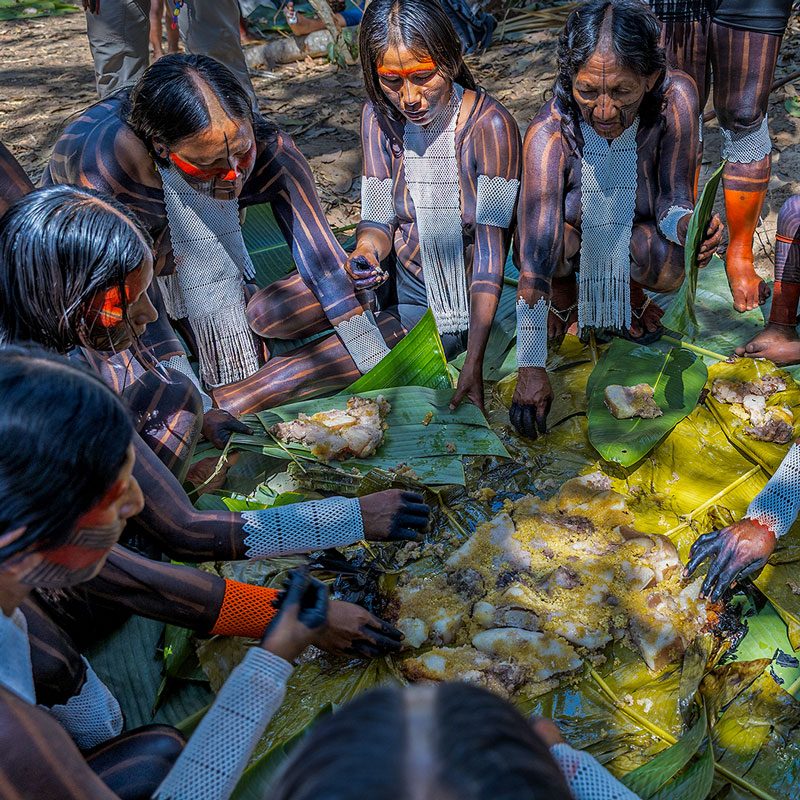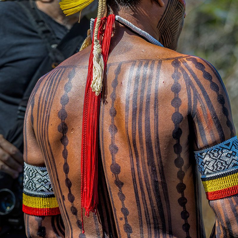 Las ceremonias del pueblo kayapó marcan los ciclos vitales. Destacan el “Ritual del Jaguar”, donde los jóvenes prueban su capacidad como guerreros, y la “Fiesta del Hombre Tatuado”, que celebra la entrada a la adultez mediante pinturas corporales simbólicas.