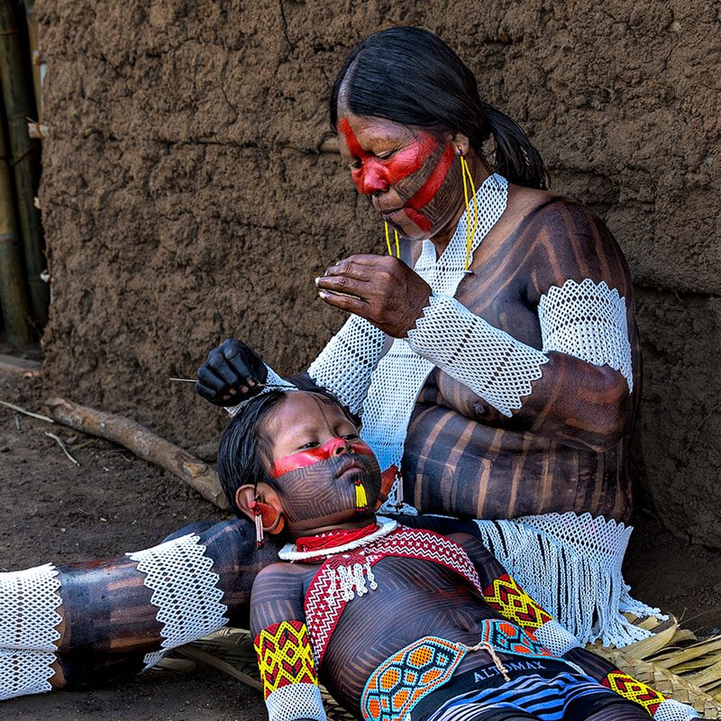Pintar es una tarea principalmente femenina. Tras el baño vespertino, todos se aplican genipapo y luego achiote para dar brillo y fragancia. También afeitan el cabello al estilo kayapó y lo ungen con aceite de babasú.