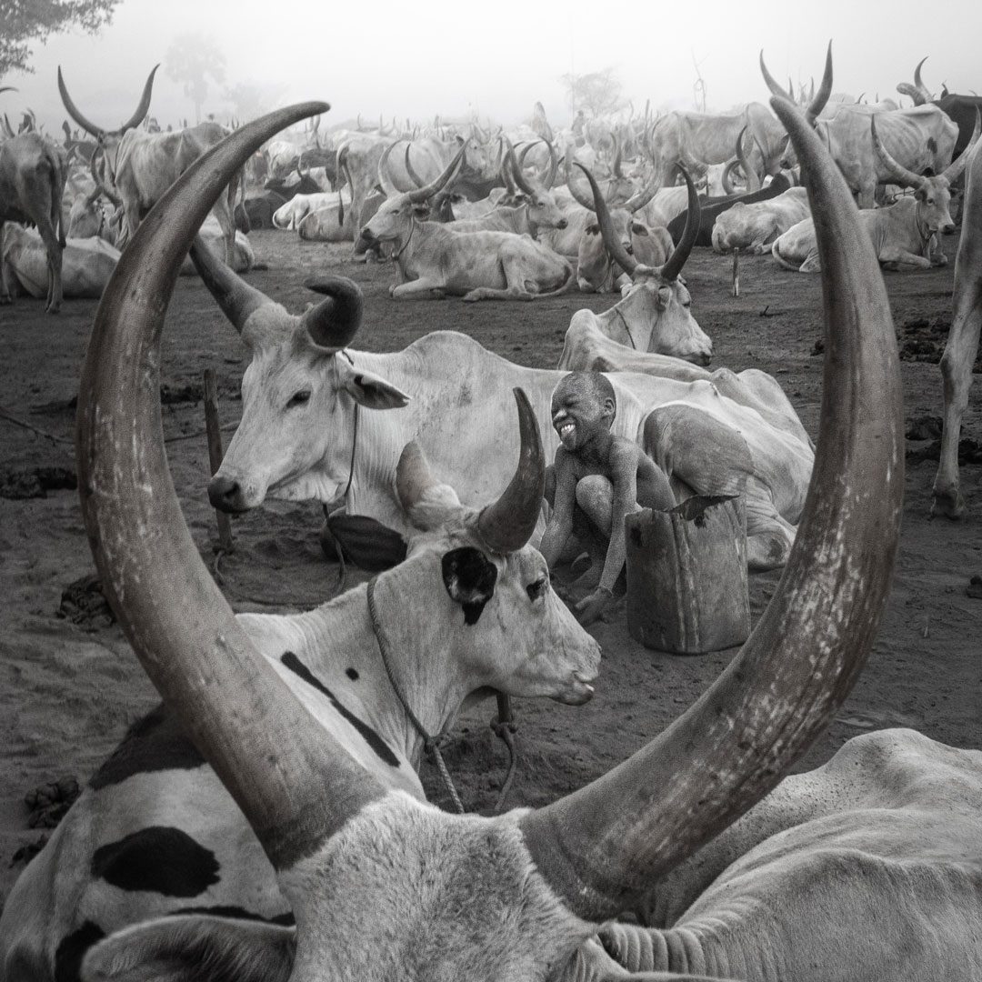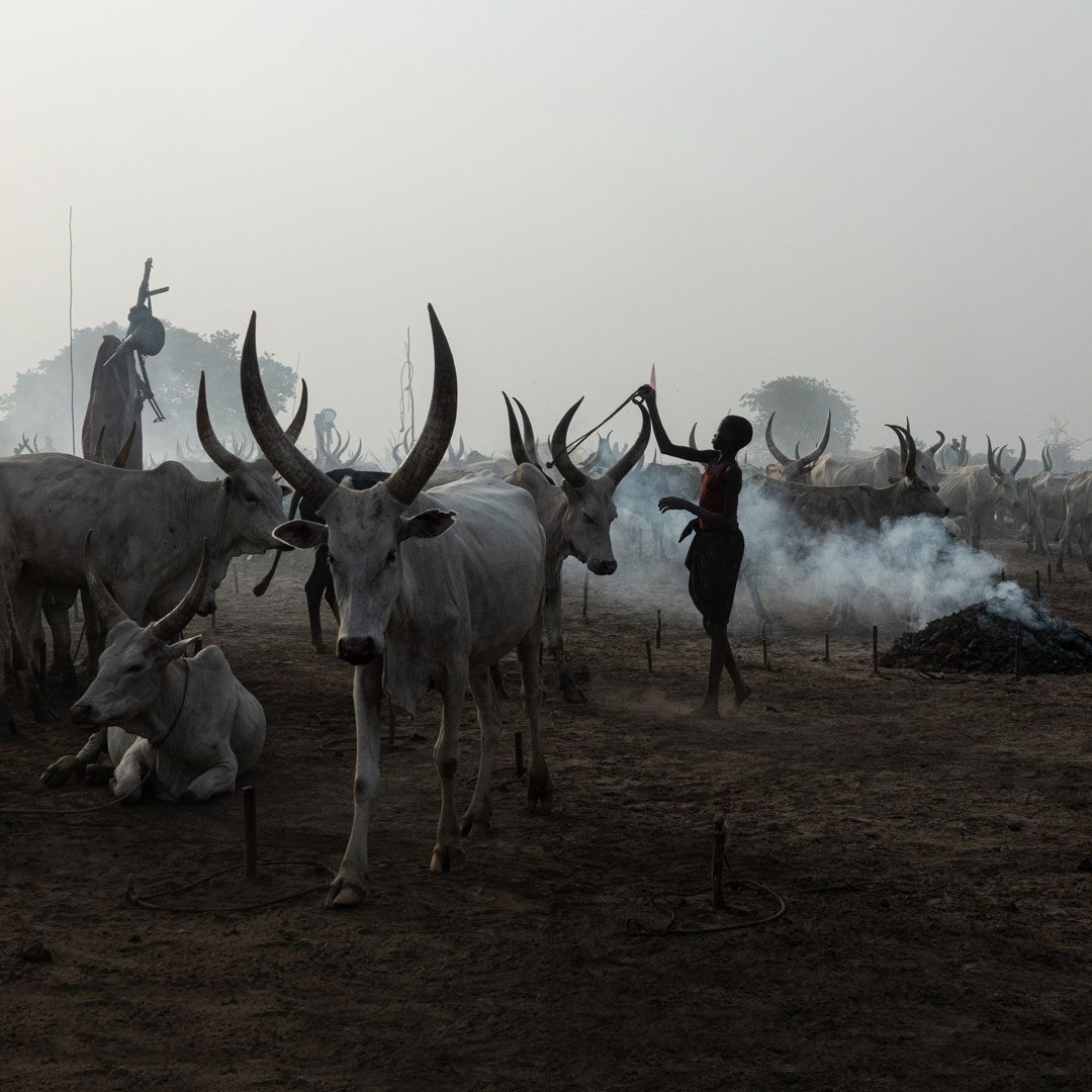 Primero los tambores, poco a poco, las tenues luces del amancer en un campamento mundari en Sudán del Sur.