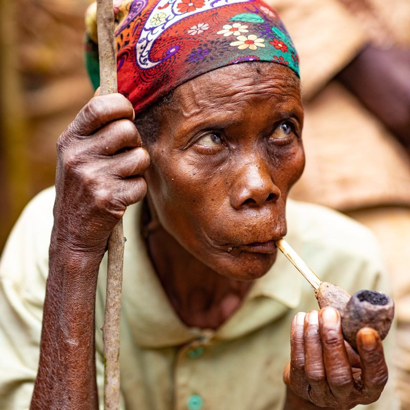 Curandera tradicional batwa fumando tabaco local durante viaje a Uganda.