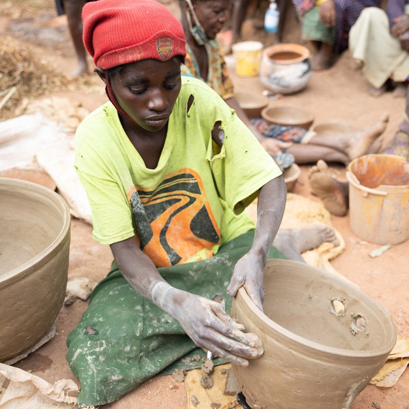Encuentro con joven ceramista batwa durante viaje a Uganda.