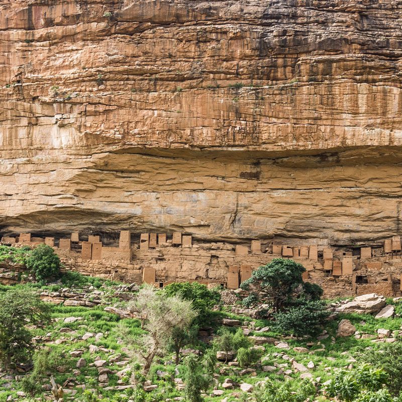 La falla de Bandiagara es una pared puntiaguda de roca ocre que se extiende a lo largo de centenares de kilómetros sobre la arena. Presenta una altura de unos 350 metros, y las viviendas que alberga, forman un conjunto considerado Patrimonio de la Humanidad por la Unesco desde 1989. En torno a este accidente geográfico encontramos poblados dogones, no solo incrustados en la propia roca sino también diseminados en la llanura anexa.