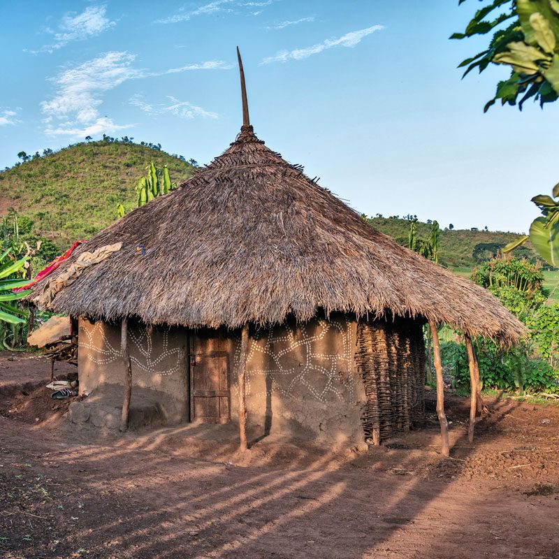 Casa menit bellamente decorada con motivos abstractos que recuerdan a la decoración corporal tradicional. /i>