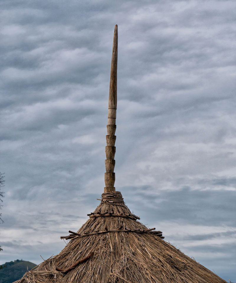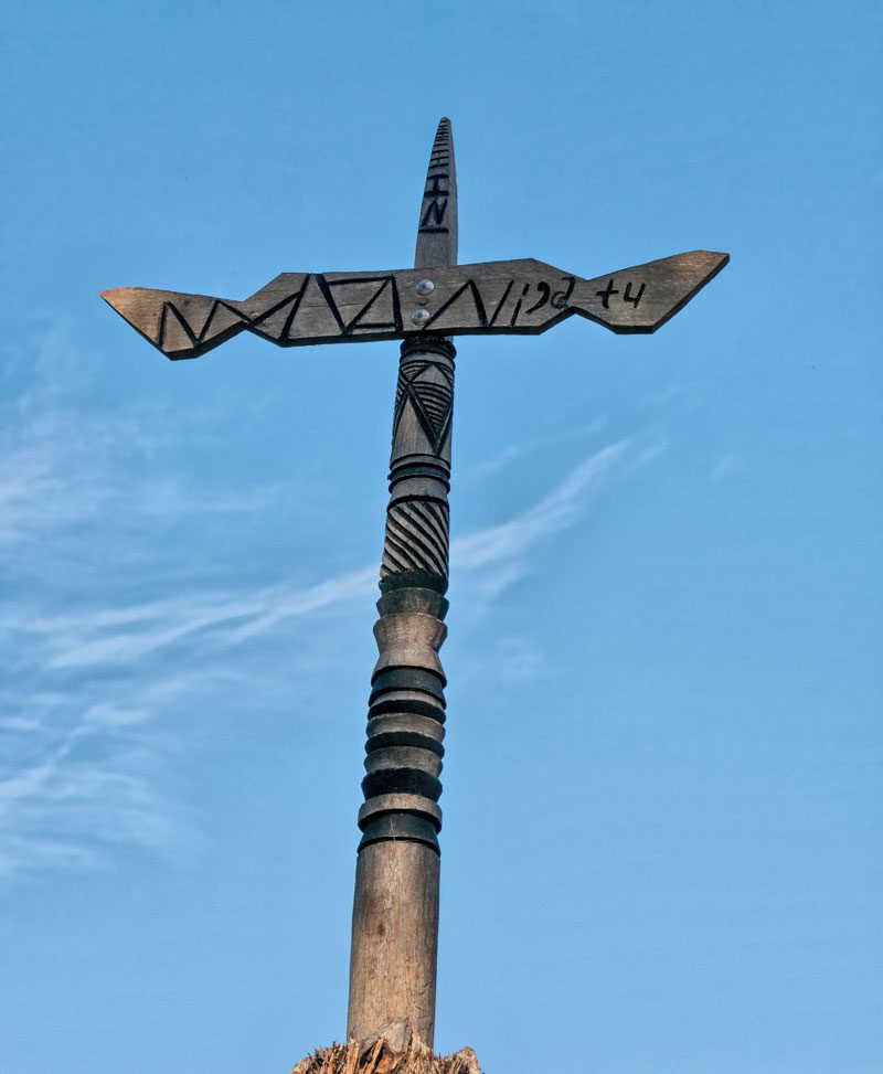 Columna vertebradora de vivienda menit tallada. Es posible que tenga una connotación erótica (falo), símbolo de fertilidad y prosperidad.