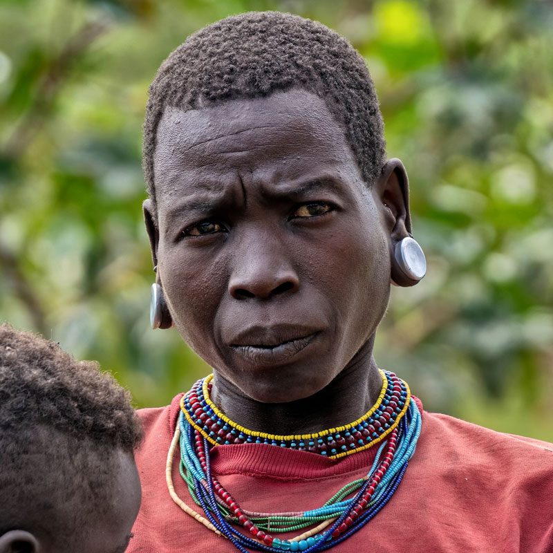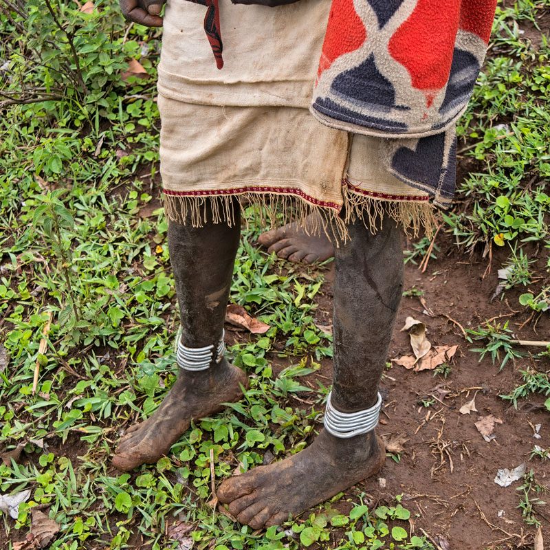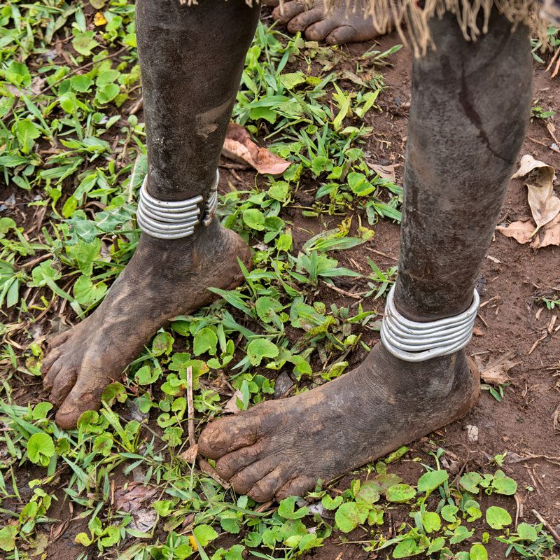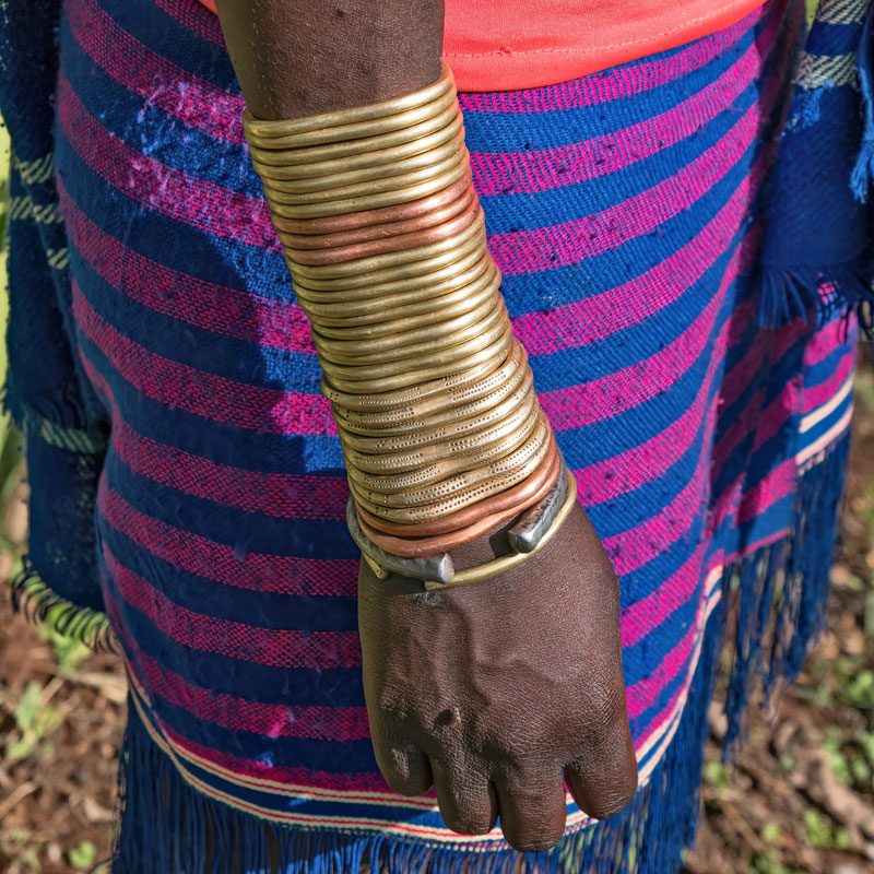 Pulseras de bronce de influencia mursi (tribu vecina, al otro lado del río Omo), de cobre y aluminio. Esta joyería indica el estatus social y civil de esta mujer; soltera y de clase alta (su familia posee más de 1000 cabezas de ganado).