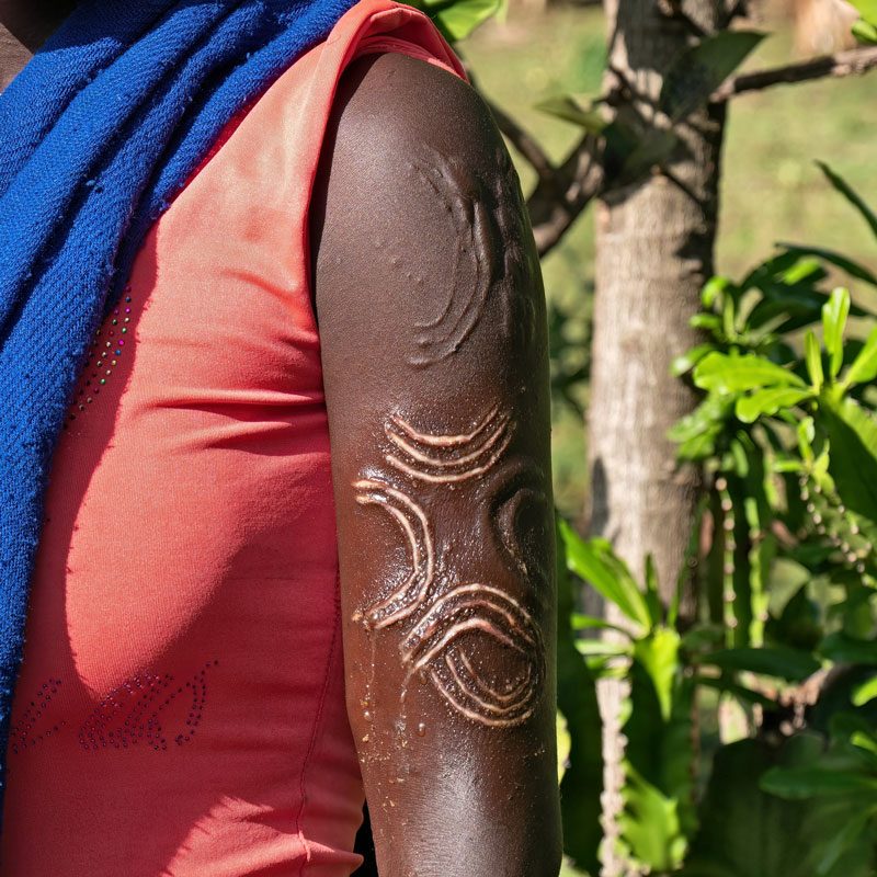 La escarificación corporal sigue viva entre los jóvenes menits de llanura (kolas). Aquí podemos observar escarificaciones recién hechas.