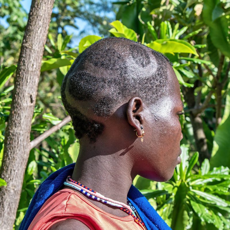 Peinado tradicional menit que muestra que el joven todavía no está casado. La pintura amarilla de la mejilla se obtiene de una piedra que se encuentra en la región de Shasha.