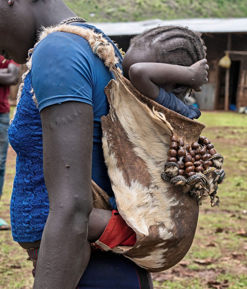 Portabebés tradicional menit hecho de piel de cabra y decorado con semillas y chapas metálicas. Este tipo de portabebés son cada vez más raros en la región ya que van siendo substituidos por telas o toallas.