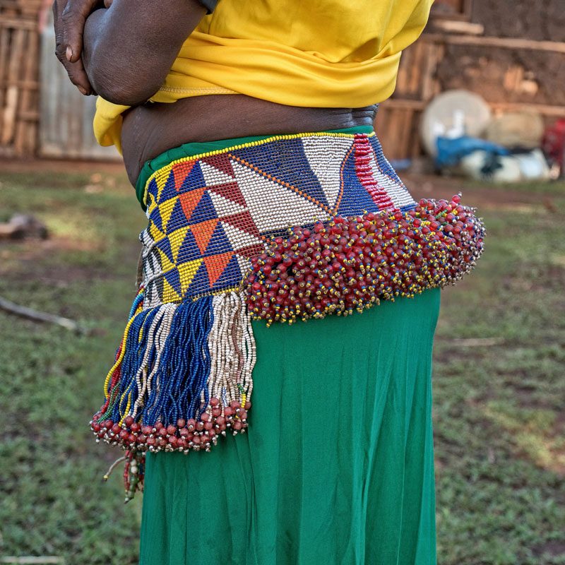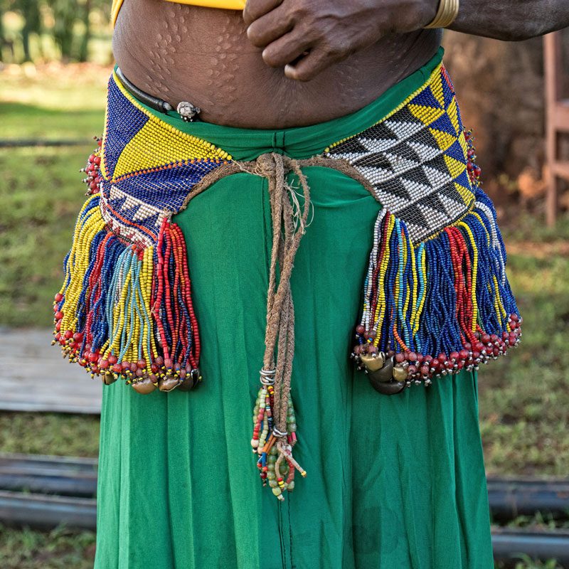 Taparrabos realizado con cuentas de cristal y plástico, con cascabeles metálicos como acabado final. Este tipo de indumentaria sólo se lleva durante ceremonias como funerales y bodas.