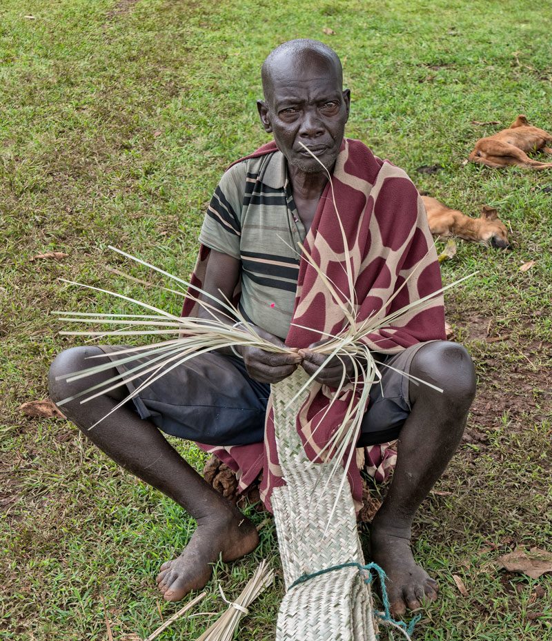 Anciano menit fabricando una estera de hoja de palma. Artesanías que pronto desaparecerán por la introducción de objetos de plástico manufacturados en los mercados regionales.