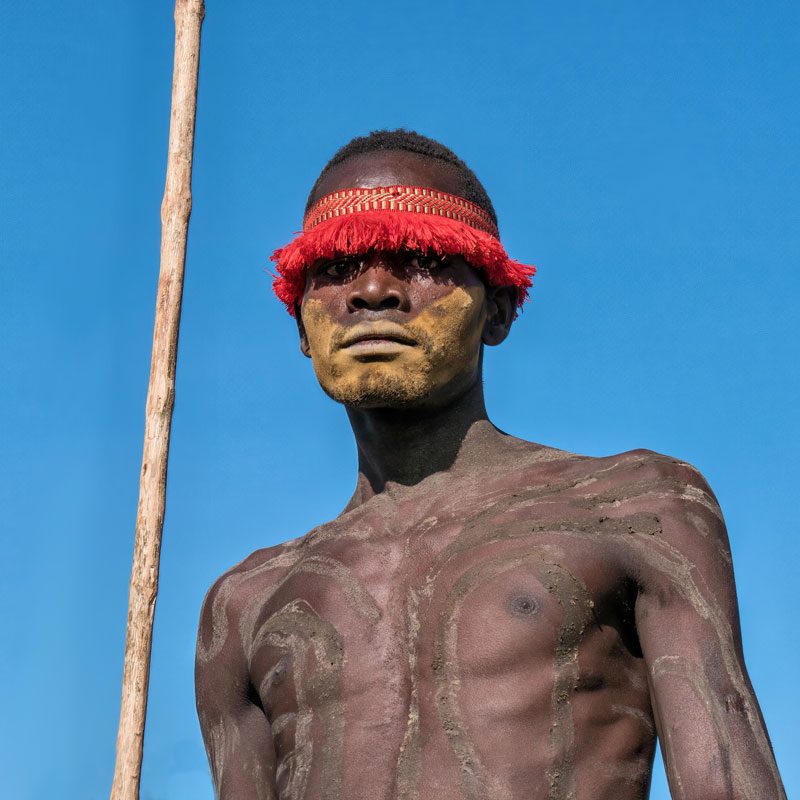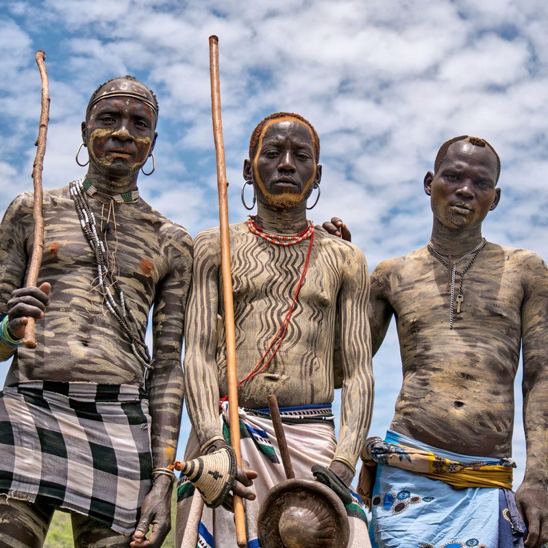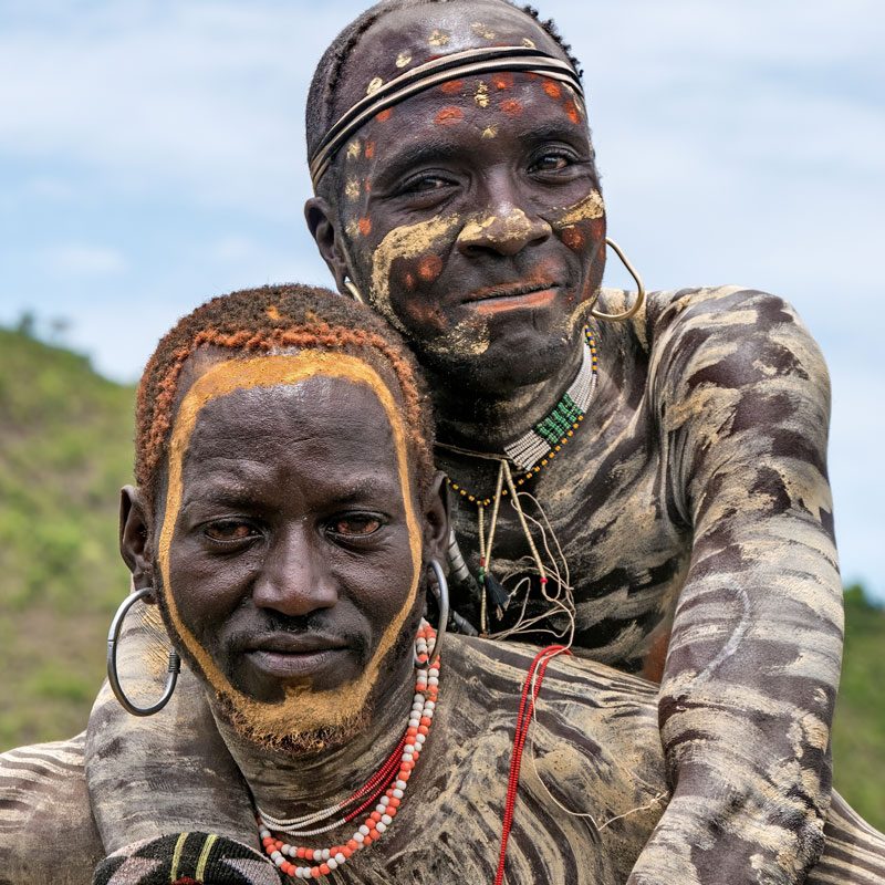 La tribu menit o me'en vive entre las fértiles montañas de Shasha y el Valle del río Omo, en el sur de Etiopía. Son unos 150.000 y su economía está basada en la agricultura principalmente. Dentro de este pueblo, el grupo 'kola' vive más aislado en la zona más seca del valle y se dedican a la cría de ganado. Los 'kolas' dedican parte de su tiempo libre a decorar sus cuerpos y rostros con arcilla y ceniza para obtener 4 colores: amarillo, rojo, azul/gris y verde... La belleza de estas pinturas y la fisonomía de los hombres menits kolas nos recuerdan a las imágenes de los nubas de Sudán fotografiados en 1974 por Leni Riesfenstahl. Es por esta razón que en Last Places los hemos bautizado como 'los nubas de Etiopía'.