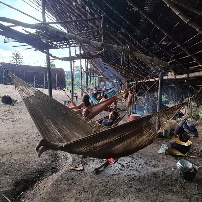 La zona central se usa para actividades comunitarias como rituales, fiestas y juegos. Cada familia tiene una hoguera propia donde prepara y cocina la comida durante el día. Por la noche cuelgan las hamacas cerca del fuego.