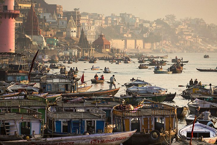 La principal actividad de Varanasi se puede encontrar en los ghats de Banaras, una serie de escalones gigantes que conducen al río Ganges. Por la mañana, los devotos bajan las escaleras para lavar sus pecados en el agua bendita y, por la noche, regresan para las ceremonias de oración alimentadas con fuego.