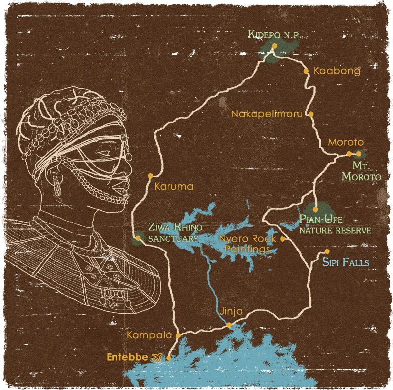 Aunque este viaje a Uganda esté focalizado en tribus, también disfrutaremos de maravillas naturales como los manantiales del Nilo, las cataratas Sipi y el Monte Morungore. También realizaremos un safari en el Parque Nacional Kidepo, habitado por unas 80 especies de mamíferos, entre ellos búfalos, elefantes, leones, cebras y avestruces. Se trata del único parque de Uganda donde es posible observar, entre otros animales, chacales, oryx, kudu mayor, gacela de Grant, además de caracales y guepardos. Para terminar el viaje, visitaremos el santuario de rinocerontes de Ziwa.