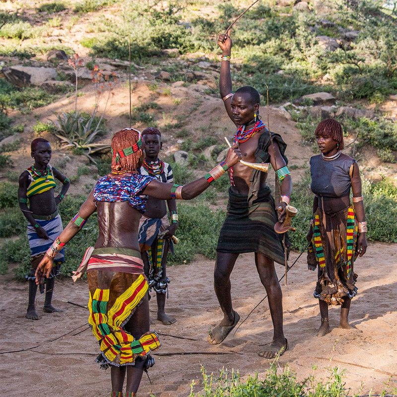 Durante este viaje antropológico a Etiopía tendremos la oportunidad de conocer a los hamers. Esta tribu vive en poblados formados por cabañas hechas con ramas dispuestas en círculo, en los que residen varias familias vinculadas. El pueblo hamer se dedica principalmente a la ganadería y al cultivo de sorgo. Existe una división del trabajo según el género y la edad. La vestimenta tradicional de la tribu hamer está hecha con piel de animal con la que se confeccionan distintos tipos de piezas de ropa. El grupo étnico hamer da gran importancia a su estética, y en concreto al peinado. Los hamers frotan su cabello con una mezcla de mantequilla, lima y tierra ocre, luego le dan forma y lo decoran con plumas. El singular ritual de iniciación del pueblo hamer consiste en saltar de un lomo a otro de una fila de toros. El iniciado debe recorrer la fila sin caer para obtener el derecho de poseer ganado, casarse y tener hijos. Durante la celebración la comunidad se congrega para animar con cantos a los jóvenes. Durante este viaje antropológico a Etiopía intentaremos asistir al ritual del salto del toro de la tribu hamer.