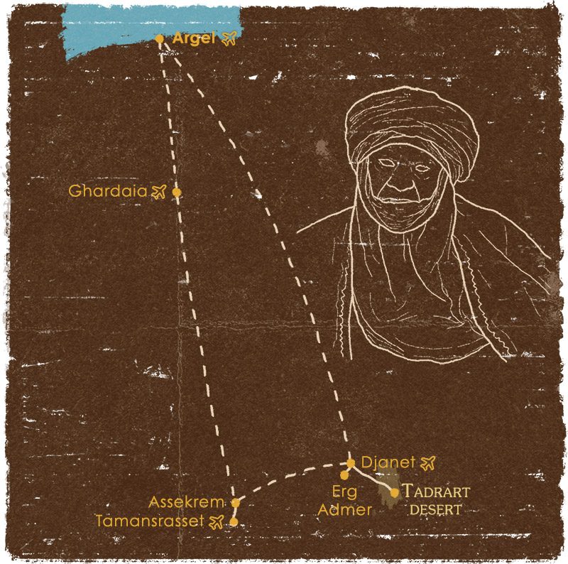 La meseta de Assekrem, que significa “el fin del mundo” en lengua tuareg, es un lugar mágico que parece alejado de toda civilización. Alrededor de los paisajes lunares de color metálico del guelta de Afilal, podremos conocer a los kel ahggar tuareg. Además, nos encontraremos con algunas familias nómadas del pueblo tuareg que viven en el desierto del Tadrart. Conversaremos con los tuaregs y disfrutaremos juntos del famoso té del desierto.