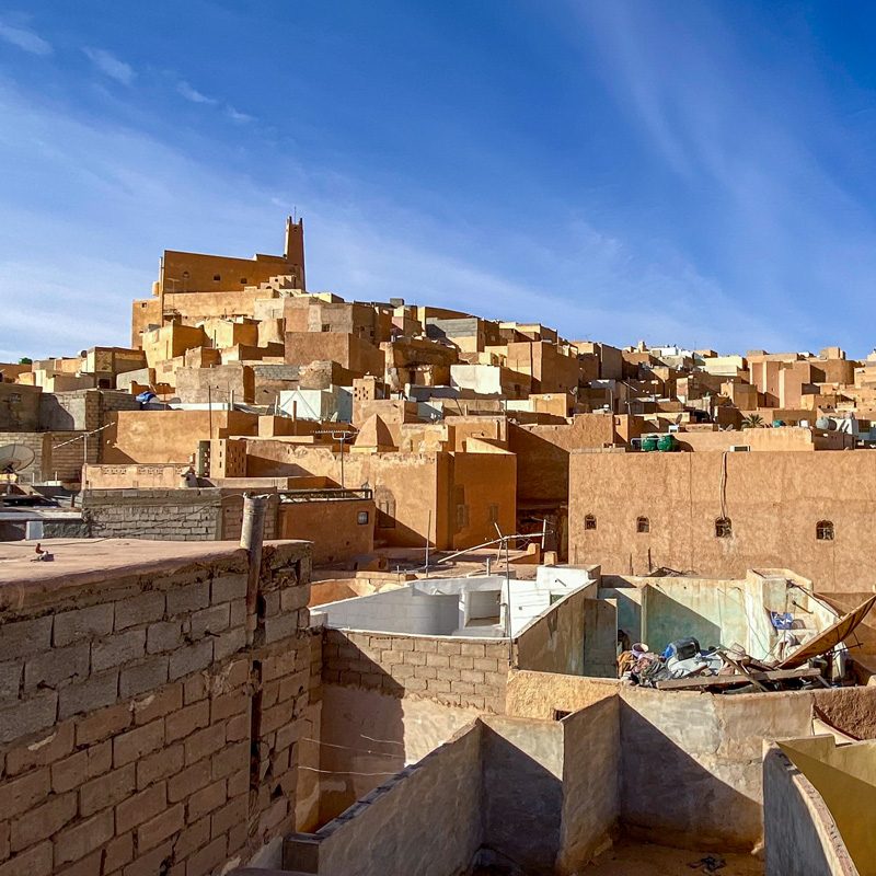 Dedicaremos dos días de este viaje a Argelia para visitar la pentápolis de Ghardaia, la ‘perla de M’Zab’, declarada Patrimonio de la Humanidad por la UNESCO. Su oasis tiene unos 10 km de ancho e incluye las ciudades históricas de Beni Isguen, Melika, Bou Noura y El Atteuf. Todas estas ciudades fundadas a partir del siglo XI por los ibaditas están situadas sobre un montículo. Los ibaditas se alejaron del Islam ortodoxo y se trasladaron a este territorio accidentado y árido. Tendremos la oportunidad de visitar dichas ciudades históricas de la zona de Ghardaia. Hoy en día, Ghardaia es el centro de comercio de todo el Sahara argelino. Por tanto, será una experiencia inolvidable visitar su zoco y el Marché à la Criée (mercado de subastas) de Beni Isguen. Allí, podremos comprar los famosos y coloridos productos locales, alfombras. Visitaremos también la gran mezquita, con aspecto de fortaleza y caracterizada por su alminar en forma de pirámide, típico de las mezquitas de la región. Asimismo, admiraremos el palmeral de la gran mezquita, con su ingenioso sistema de distribución de agua.
