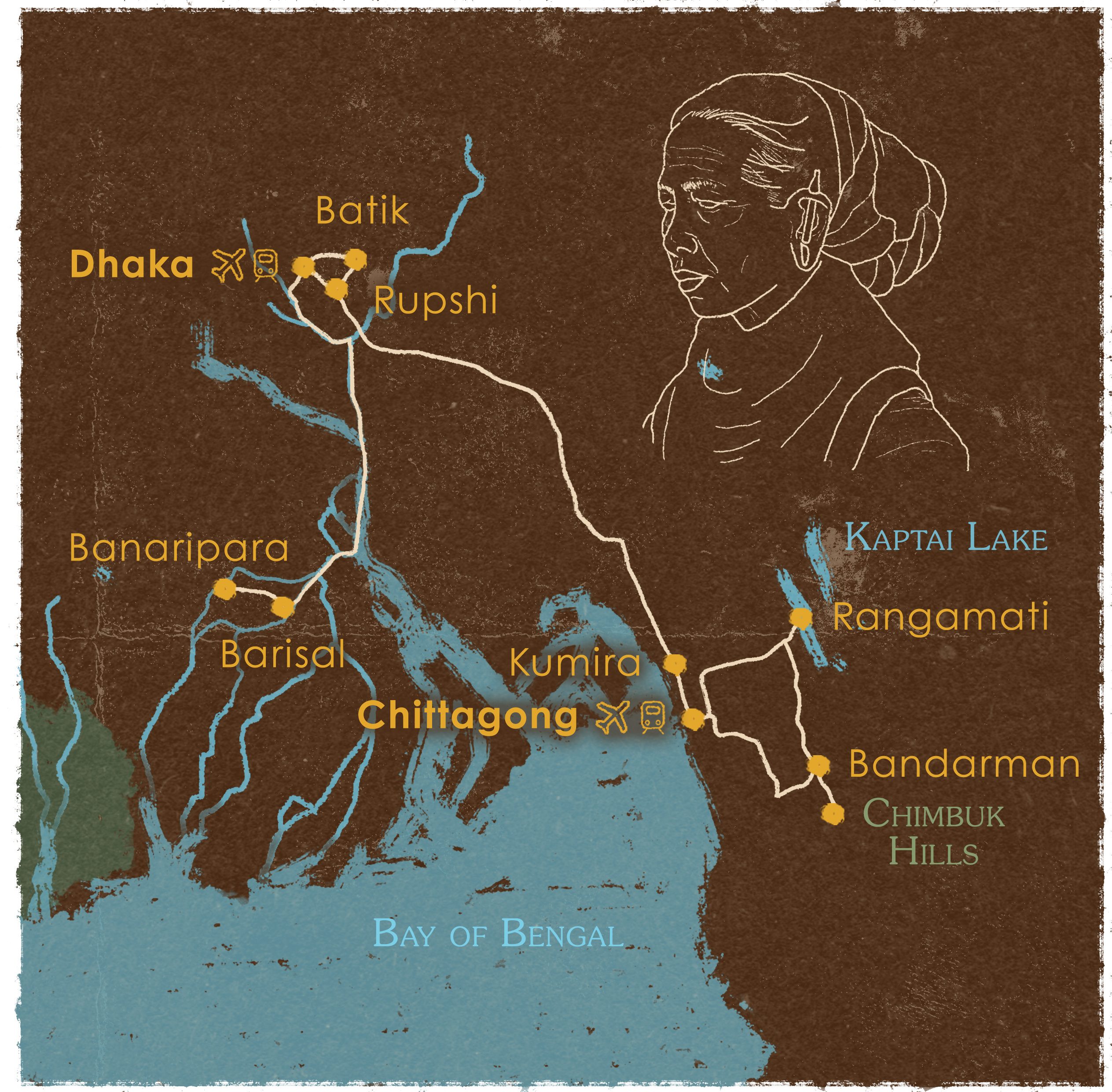 Empezaremos desde la capital Dhaka para conocer las llanuras regadas por los ríos Brahmaputra, Padma, Meghna y un sin fin de afluentes. Avanzaremos hacia su desembocadura hasta los Sunderbans, el bosque de manglar más grande del mundo. Visitaremos algunos mercados flotantes y pueblos de pescadores para conocer las tradiciones locales. Seguiremos hasta la ciudad de Chittagong y su gran astillero de desguace de barcos. Terminaremos la ruta en la región de Bandarban, cerca de la frontera con Tripura y Myanmar. En la colina de Nilachal y los montes Chilluk tendremos la oportunidad de conocer la realidad y las costumbres de varias minorías étnicas como los tripuras, los mrus y los bawms.