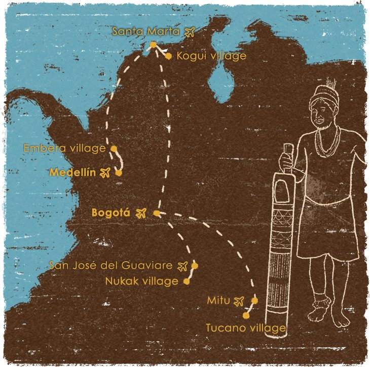 Continuaremos el viaje a Colombia hacia el corazón del Amazonas colombiano. Navegaremos por el río Vaupés entre comunidades indígenas aisladas. Durante el trayecto conoceremos paisajes fluviales de gran belleza. Al llegar, la comunidad tucano nos dará la bienvenida en su maloka. Aquí descubriremos una cosmovisión compleja y profundamente simbólica. Compartiremos jornadas de pesca tradicional y caminatas por la selva. Además, observaremos el trabajo agrícola y la preparación de alimentos rituales. La música y los cantos cerrarán las jornadas junto al fuego.