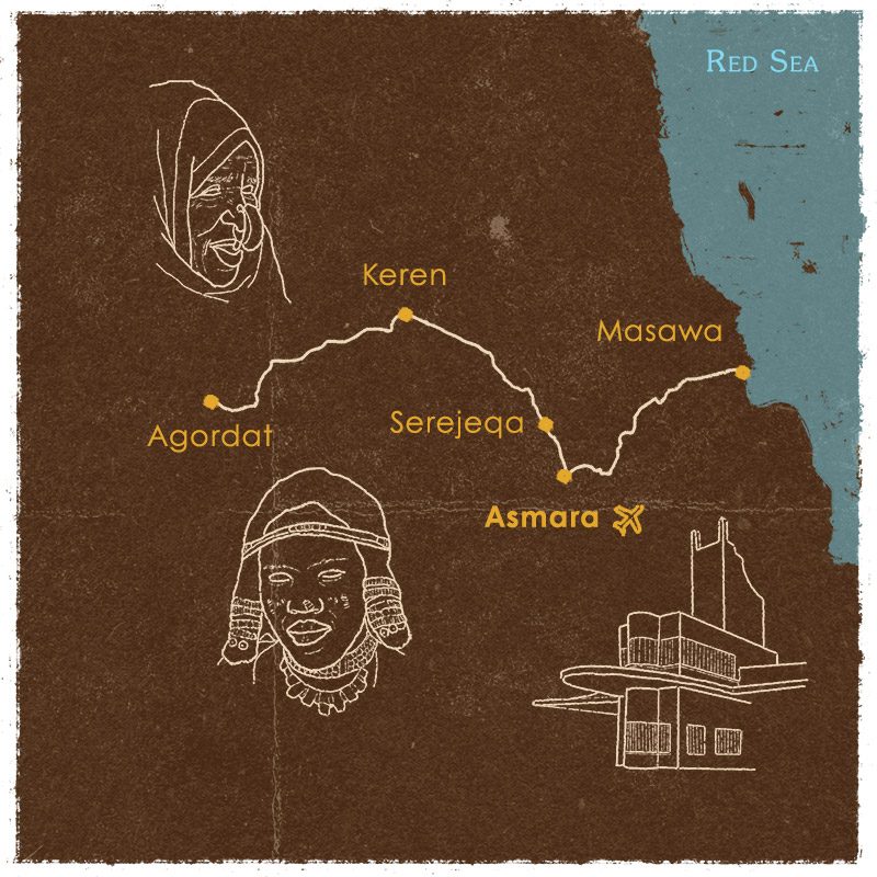 Visitaremos los lugares más interesantes de la ciudad de Asmara, que es Patrimonio de la Humanidad por la UNESCO. Nos acercaremos a la Catedral de Santa María de estilo románico, al futurista garaje Fiat Tagliero, al depósito de reciclaje Medeber, el Cinema Impero de estilo Art Decó, etc.