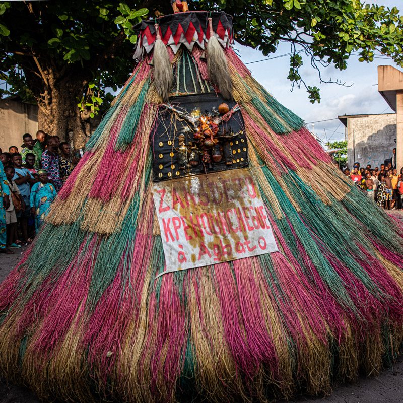 Seremos testigos de la danza zangbeto de los fon. Estos seres considerados como protectores de la noche vagan por las calles para detectar ladrones y brujas y para proveer la ley y el orden.