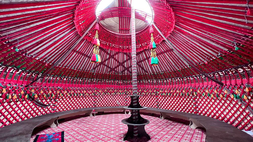 A continuación, nos adentraremos en la historia antigua de la región. Visitaremos el yacimiento arqueológico de Balasagun y el minarete de Burana, vestigios de antiguas civilizaciones de Asia Central. Más tarde, conoceremos una cooperativa de mujeres kirguisas en Kochkor. Durante esta experiencia, aprenderemos cómo se elaboran los shyrdaks, las tradicionales alfombras de fieltro nómadas. Este encuentro aporta una dimensión social clave al viaje etnográfico a Kirguistán.