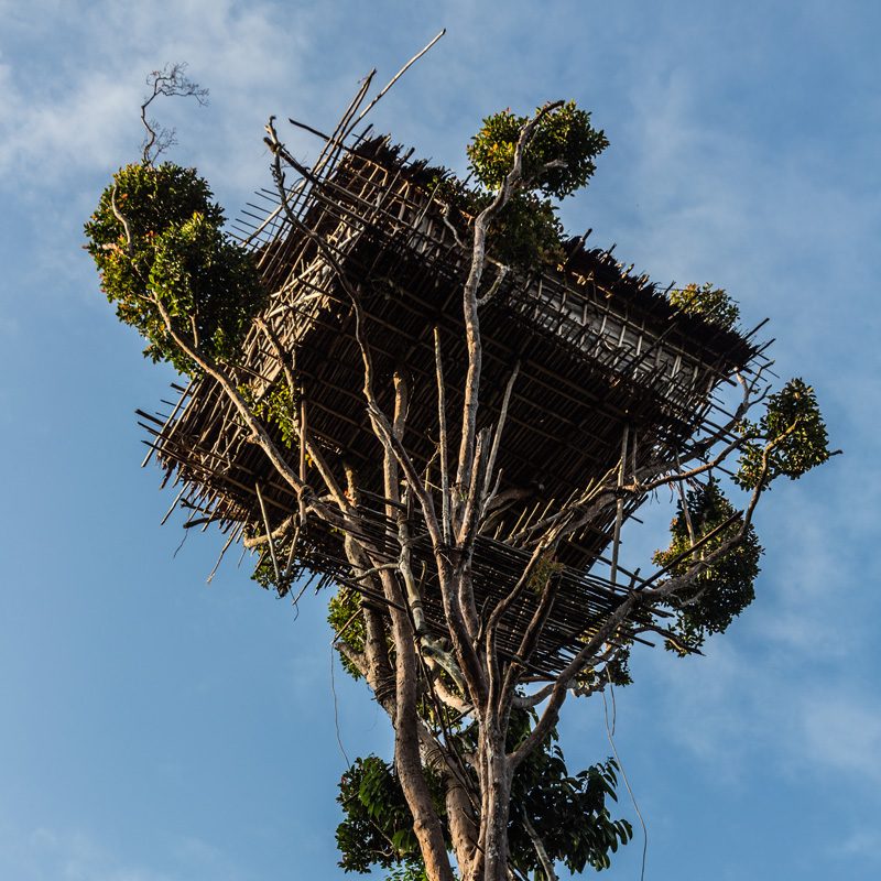Durante este viaje etnográfico a Papúa Occidental tendremos el privilegio de visitar las legendarias casas-árbol de la cultura korowai. Estas construcciones se elevan hasta 30 metros sobre el suelo, haciendo uso de altos y robustos árboles baniano como eje central. En la copa se encuentra la vivienda, que tiene el suelo suspendido forjado en ramas y varas y el techo constituido por hojas entrelazadas de manera concienzuda. La estructura central y la puerta están hechas con ramas fijadas con roten. A lo largo del tronco del árbol hay una escalera fija que se erige con peldaños del mismo material.Las razones por las que el pueblo korowai construyen a tan gran altura estas viviendas son las siguientes: ofrece protección contra las inundaciones, facilidad para evacuar el humo al cocinar, permite guardar distancia con animales peligrosos (jabalíes, serpientes o insectos portadores de enfermedades) y otorga capacidad de avistamiento y defensa contra enemigos de otros grupos tribales.