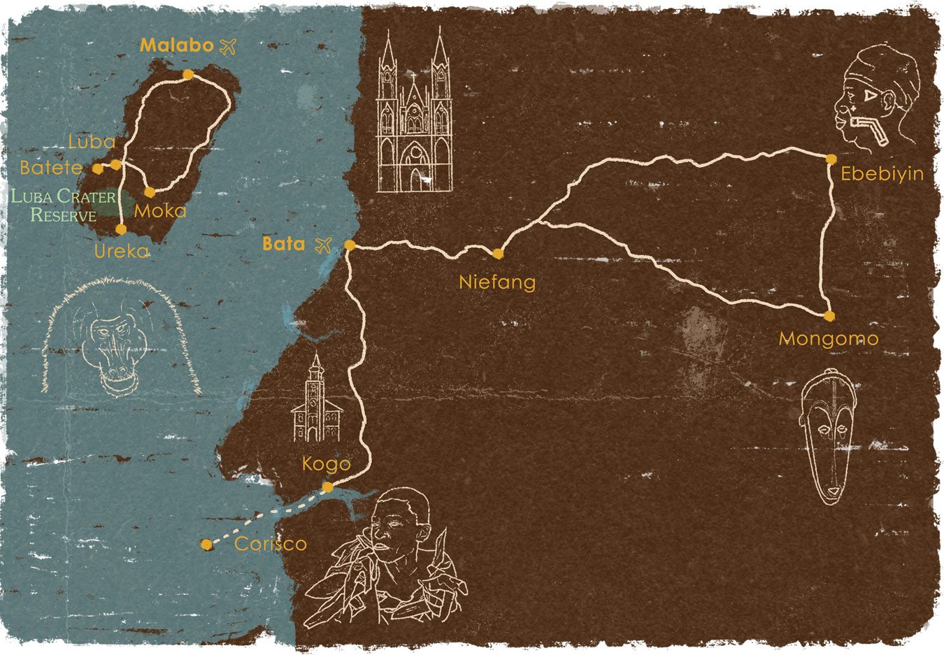 Remontaremos con una piragua a motor el río Mitong, un afluente del Muni, hasta llegar a una comunidad aislada donde todavía sobrevive la antigua religión bantú conocida como Bwiti. A nuestra llegada seremos recibidos por el jefe tradicional del poblado. Tendremos una recepción con los poderes fácticos de esta remota región de la Guinea Ecuatorial interior. Después de la bienvenida, visitaremos el poblado y conoceremos a su gente. Tendremos el lujo de presenciar una ceremonia Bwiti, con música, bailes y máscaras. Nos introduciremos en la Guinea Ecuatorial pre-colonial, cuando el mundo de los espíritus y de la selva marcaba los tiempos vitales. Realizaremos una excursión por la selva acompañados por el curandero del poblado que nos explicará las propiedades de diversas plantas y cortezas.