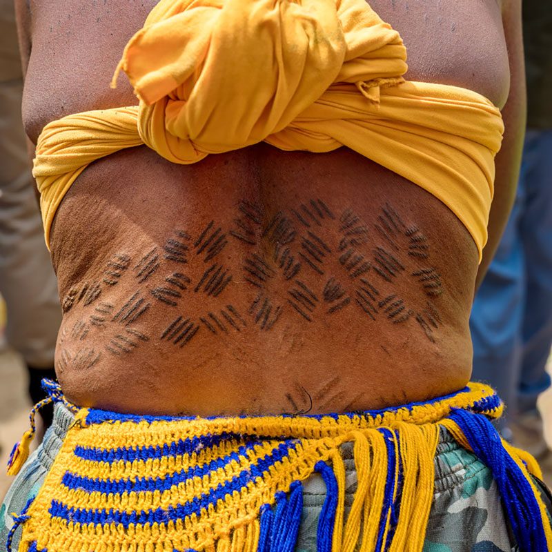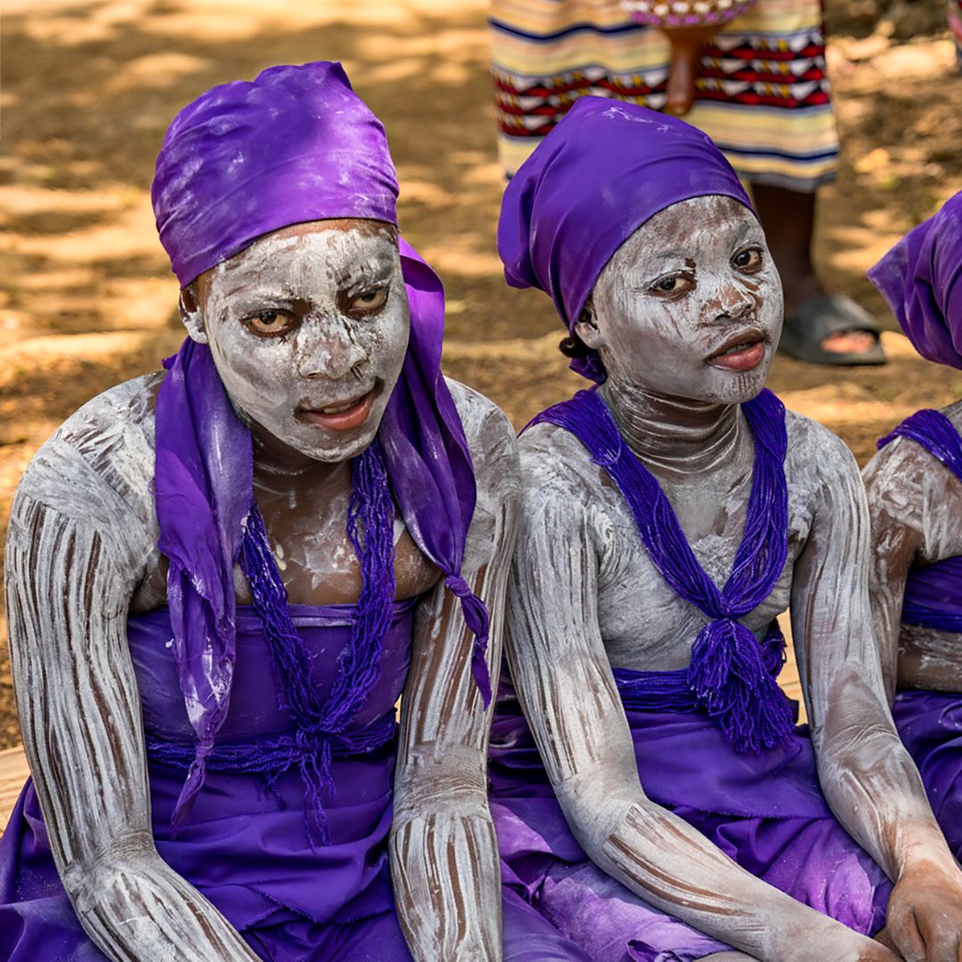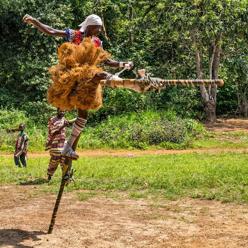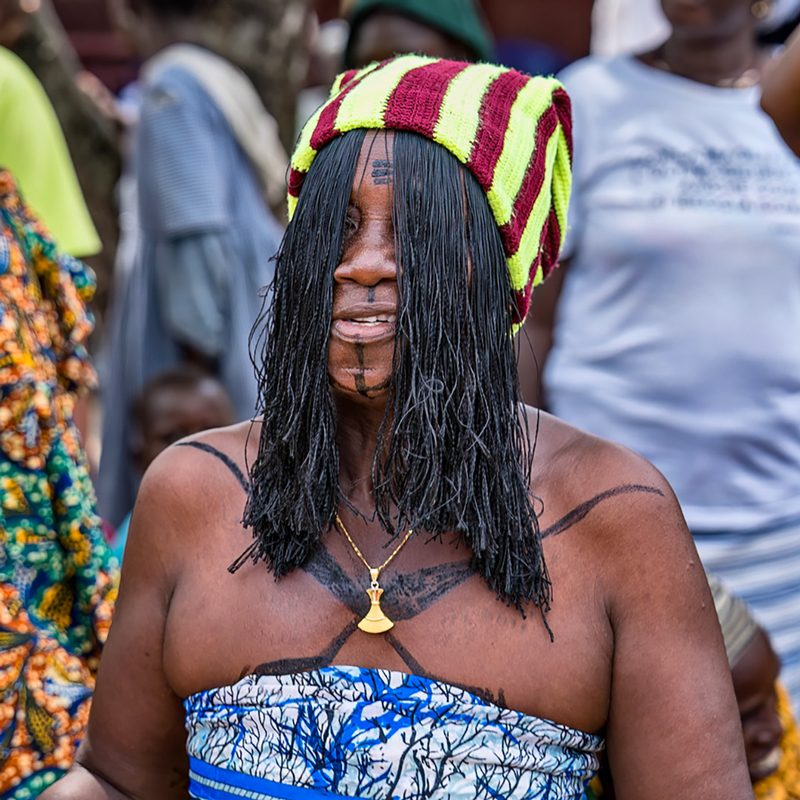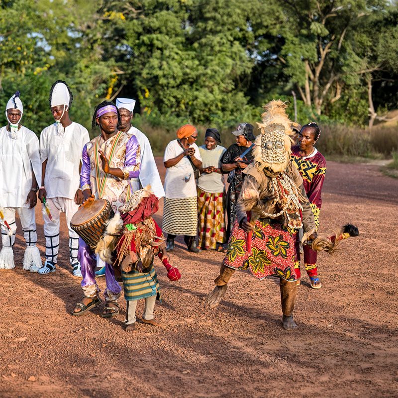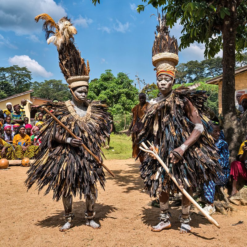 Más al sur, el paisaje cambia radicalmente. Entramos en la Guinea selvática, una de las zonas más bellas de África Occidental. En un poblado toma presenciaremos la ceremonia Wonileghaghi. Esta danza, conocida como la de los “Hombres Pájaro”, solo se celebra en esta región. Además, observaremos máscaras tradicionales y tatuajes rituales femeninos. La tradición animista permanece aquí viva y profundamente integrada en la vida cotidiana.