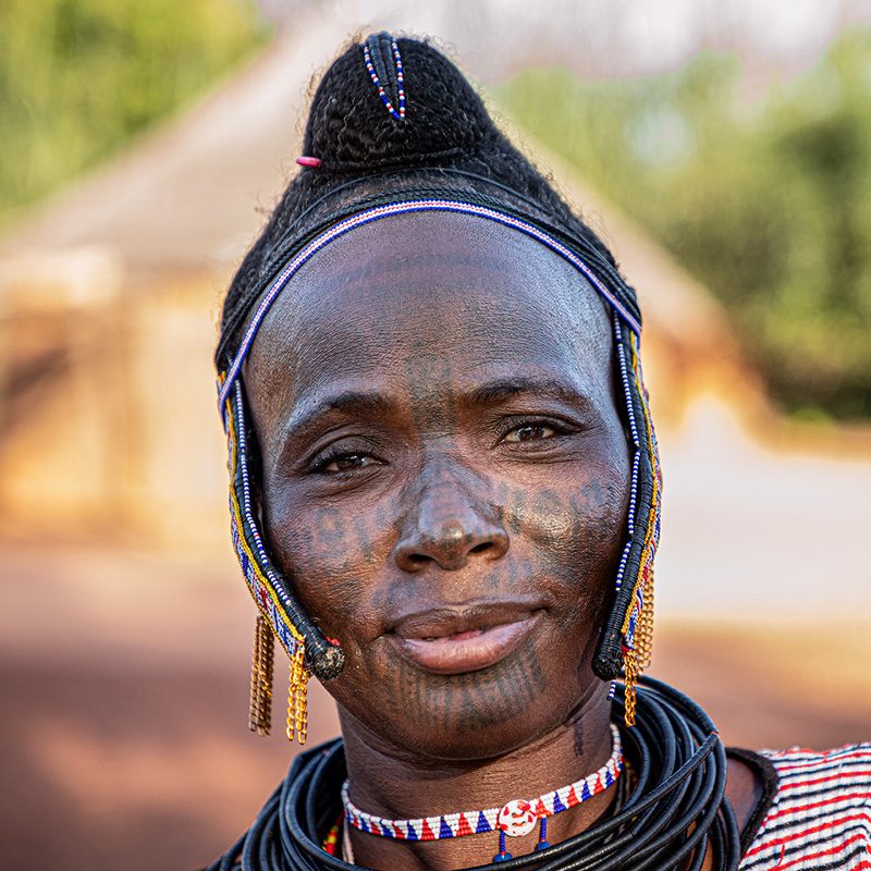 Vistaremos un campamento de nómadas Fulani borgu, famosos por sus tatuajes faciales y peinados decorativos.