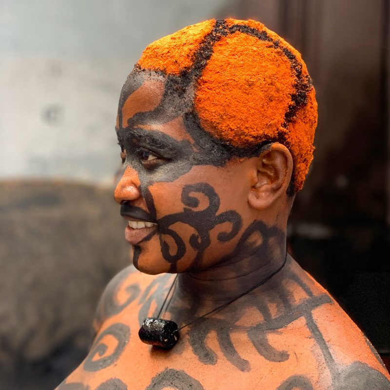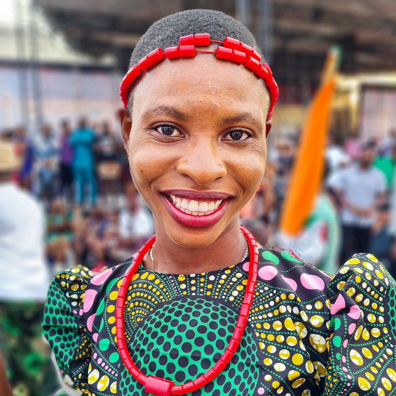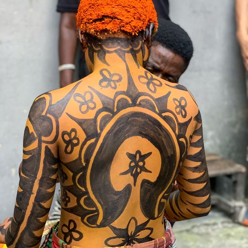 Nos dirigiremos hacia el río Níger, al corazón de la Nación Igbo. Alrededor del pueblo de Ari encontraremos las últimas casas y santuarios decorados con la antigua técnica de pintura Uli. Nos encontraremos con los jefes locales y las mujeres mayores, quienes nos contarán sobre el simbolismo de los patrones Uli. Además, nos harán una demostración de pintura corporal Uli. Después de este momento especial, nos dirigiremos hacia la ciudad de Onitsha. Esta es una antigua ciudad histórica, famosa por sus espectáculos de máscaras.
