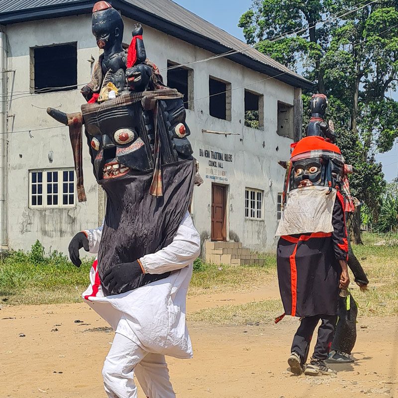 En Abakaliki disfrutaremos de un tradicional espectáculo de máscaras igbo Ndi. También, disfrutaremos de un espectáculo de máscaras en el vecindario de Ngwo, situado en la cima de las colinas de Enugu. Además, durante este viaje tribal a Cross River (Nigeria) intentaremos organizar una mascarada Ijele en Onitsha. De hecho, la máscara Ijele es considerada la más grande de toda África.