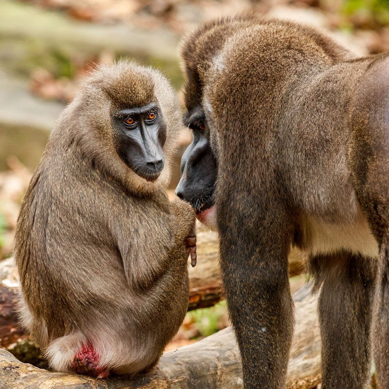 Los drills son uno de los primates más amenazados de África, y el Rancho Drill es el único lugar en el mundo donde se pueden ver grupos de drills cautivos de tamaño natural en su hábitat natural. Los fundadores de los grupos de drills fueron rescatados como huérfanos después de que sus madres fueran asesinadas ilegalmente para obtener carne de caza. Hay 5 grupos de drills, cada uno en su propio recinto vallado eléctricamente, alimentados por nuestro sistema de energía solar. Los recintos se pueden alcanzar por diferentes senderos sinuosos a través del bosque; el perímetro del recinto más grande tiene casi un kilómetro de largo.